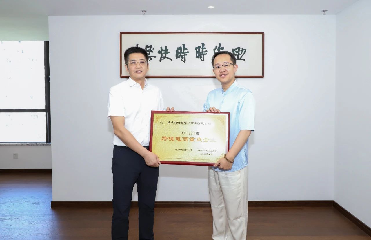 随后,高金全一行来到新时颖电子商务有限公司,察看企业展厅和运营中心,与企业负责人深入交流,了解外贸出口、团队建设、国内外电商平台入驻等情况,就跨境电商产业和东海跨境电商产业生产圈提质发展思路进行交流,协调解决困难问题,并为企业颁发2025年度“重点企业”“跨境电商重点企业”和2024年度“进出口贡献大户”牌匾。