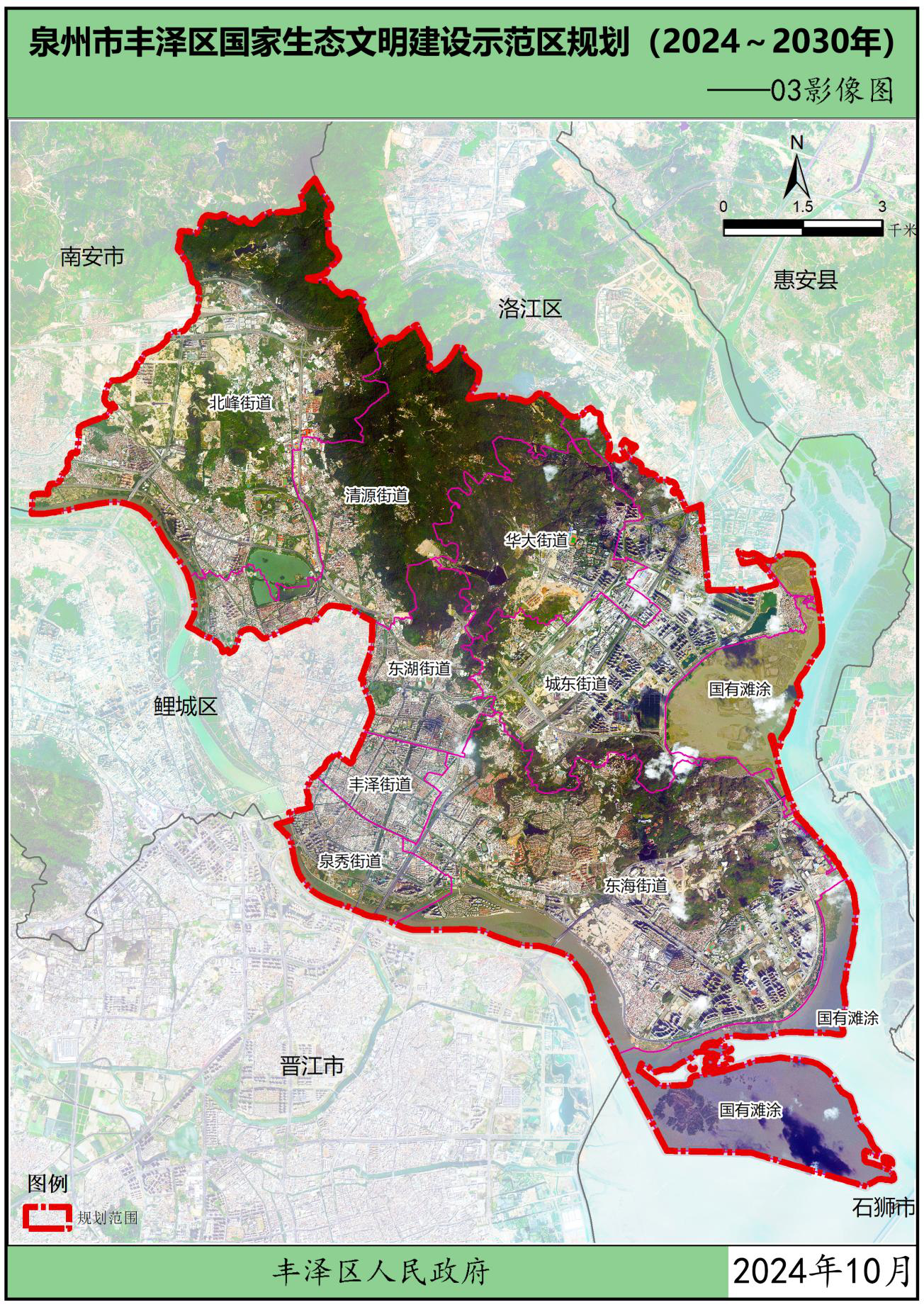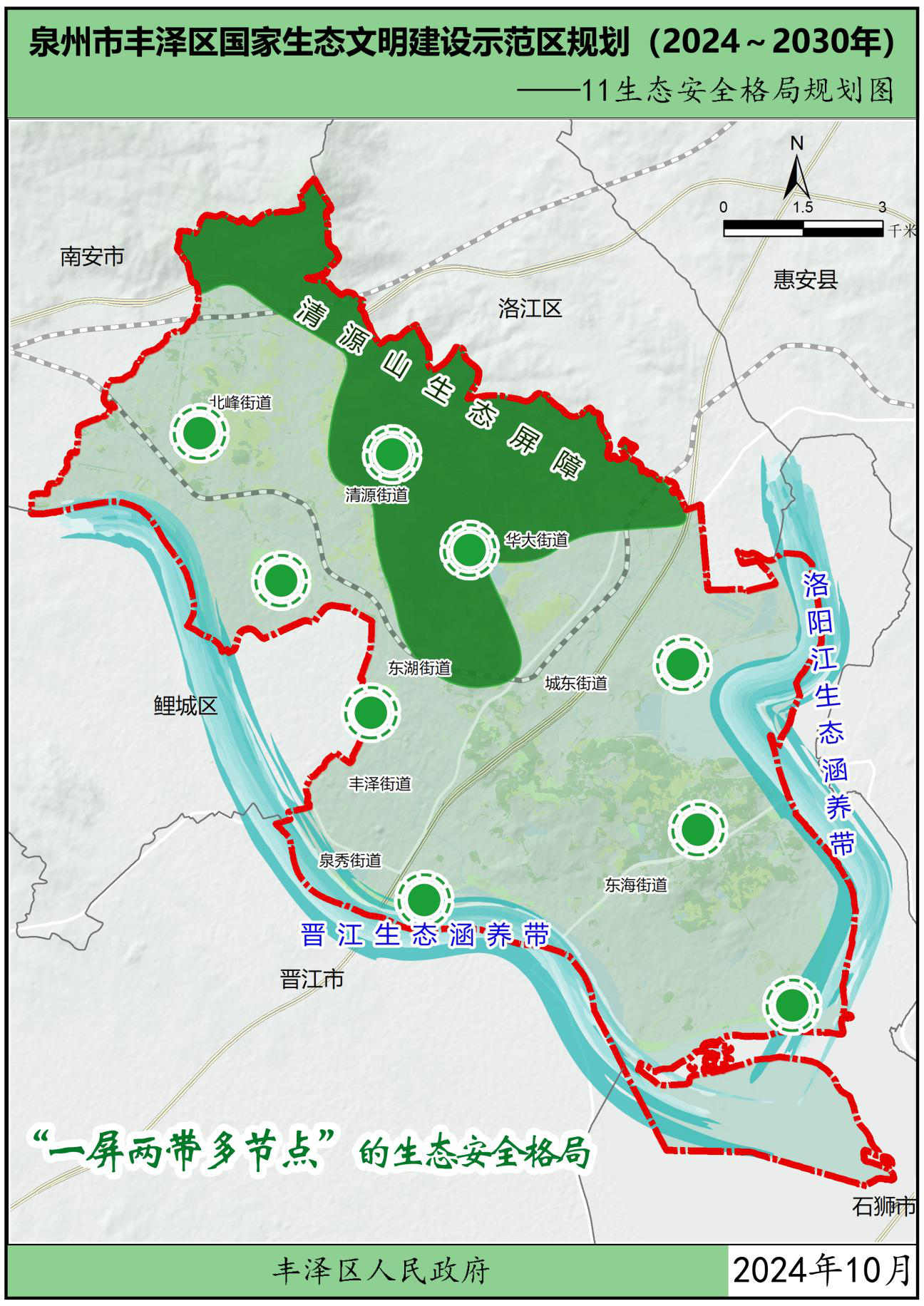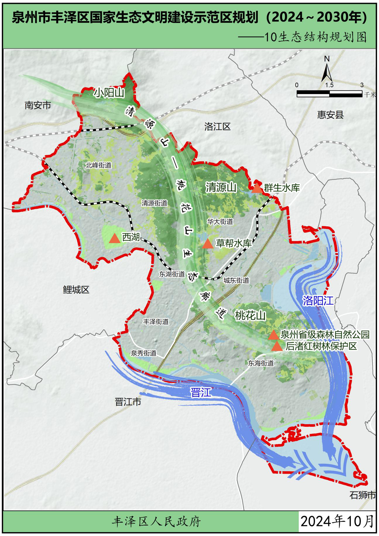 为贯彻党中央、国务院关于生态文明建设的战略部署,按照中华人民共和国生态环境部办公厅关于印发《国家生态文明建设示范区规划编制指南(试行)》的通知(环办生态函〔2021〕146号)以及关于印发《生态文明建设示范区(市)建设指标》《生态文明建设示范区(县)建设指标》《生态文明建设示范区管理规程》《“绿水青山就是金山银山”实践创新基地建设管理规程》的通知(环办生态〔2024〕4号)要求,在葡京娱乐场 委、区政府领导下,结合福建省、泉州市市生态文明建设工作实践及要求,立足葡京娱乐场 自身优势,葡京娱乐场 组织编制了《葡京娱乐场 生态文明建设示范区规划(2024~2030年)》(以下简称“规划”),规划围绕目标责任、生态安全、生态经济、生态文化、生态文明制度5大方面,制定了主要任务及重点工程。本规划是指导各街道各部门分类有序地把葡京娱乐场 建设成为生态优良、环境优美、发展优质的生态文明建设示范区的重要依据。规划基准年为2023年,规划期为2024-2030年。